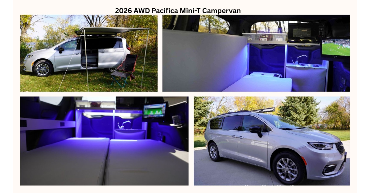 Built on the AWD Chrysler Pacifica chassis and powered by a 3.6-liter V6 engine, the 2026 Mini-T Campervan achieves up to 25 MPG. Inside, it includes a pull-out bed for two, refrigerator, microwave oven, sink with fresh- and gray-water systems, and a solar-supported electrical setup for off-grid use.